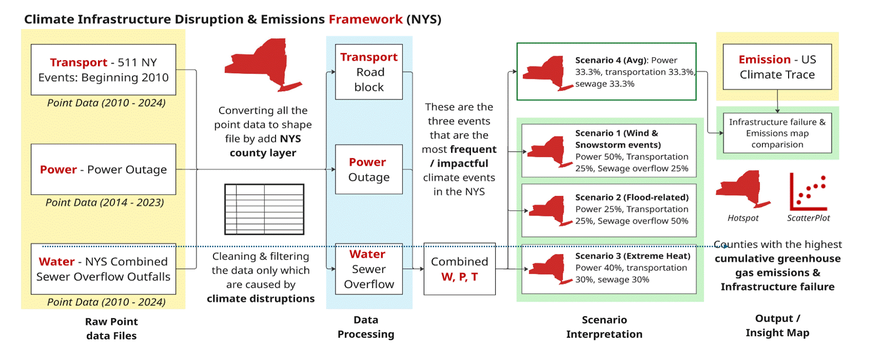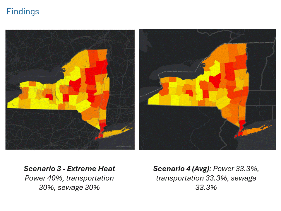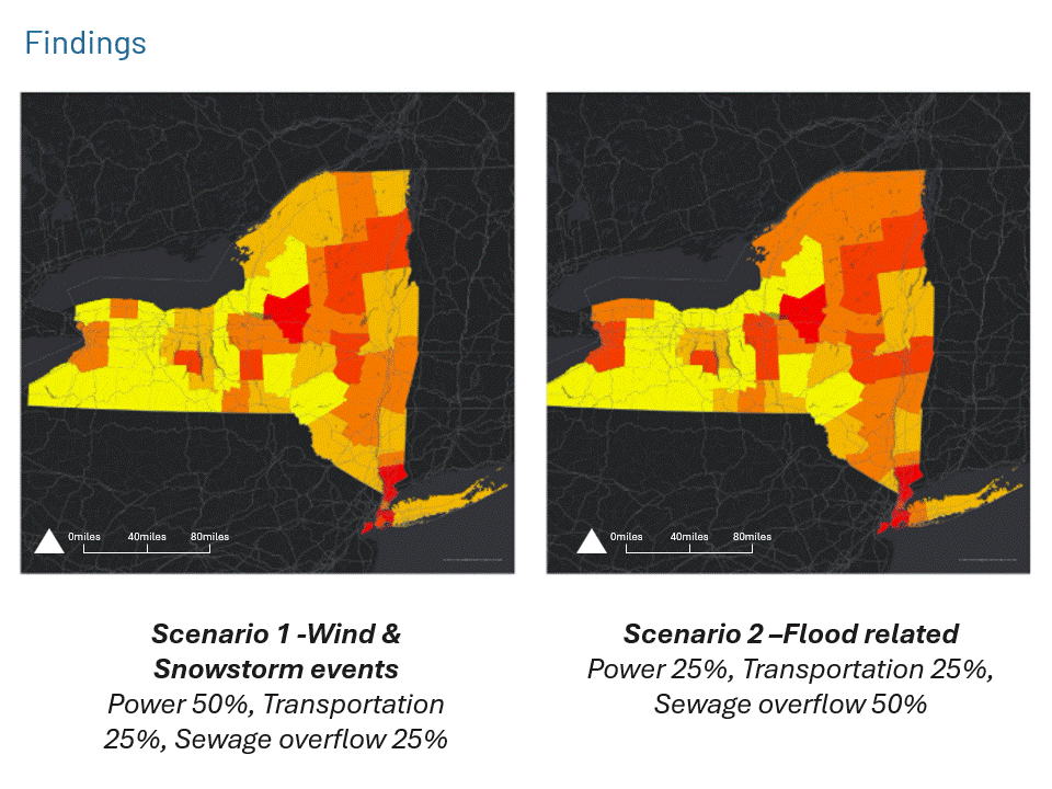 Developed a geospatial decision framework integrating infrastructure networks, climate hazard layers, emissions data, and service reliability indicators. Using ArcGIS and spatial suitability analysis, infrastructure exposure, emissions burden, and service vulnerability were mapped and evaluated to identify regions facing overlapping risks. Multi-layer overlay and spatial classification techniques were used to generate infrastructure vulnerability and investment priority maps across New York State.