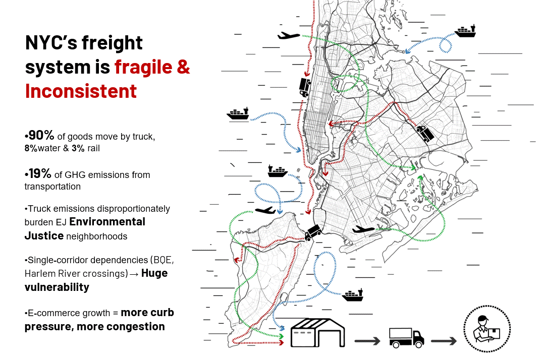 New York’s freight system moves nearly 90% of goods by truck, producing disproportionate environmental and congestion impacts in Environmental Justice neighborhoods. At the same time, city agencies and fleet operators face increasing pressure to electrify and reduce emissions.