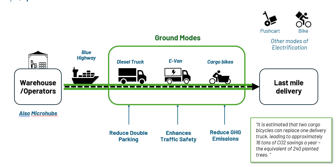 New York’s freight system moves nearly 90% of goods by truck, producing disproportionate environmental and congestion impacts in Environmental Justice neighborhoods. At the same time, city agencies and fleet operators face increasing pressure to electrify and reduce emissions. However, mode substitution is not universally feasible. Distance thresholds, capacity constraints, congestion, service time limits, and disruptions such as EV downtime restrict the operational viability of cargo bikes and e-vans.