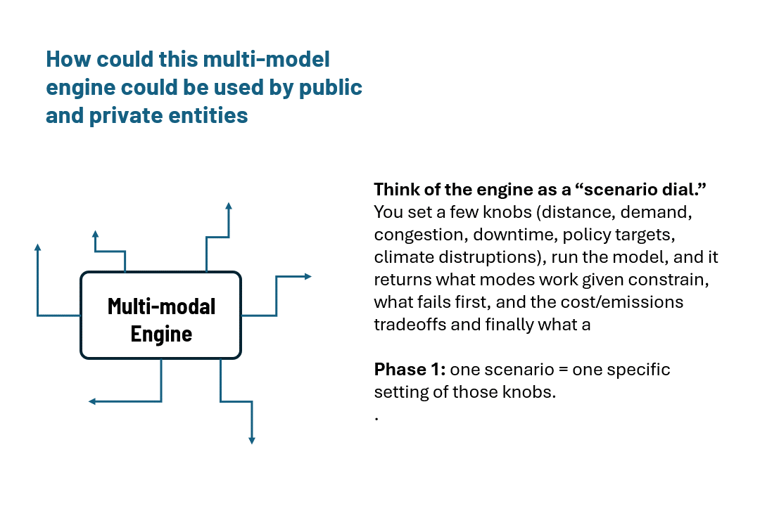 This framework transforms last-mile freight planning from static mode comparison into a constraint-driven decision tool. By embedding congestion, fleet limits, safety thresholds, disruption scenarios, and policy targets, the model reveals where zero-emission modes are operationally viable, and where they fail. Public agencies can stress-test infrastructure and emissions mandates before deployment, while private operators can evaluate fleet mix, hub placement, and cost exposure under real-world conditions. The engine aligns climate goals with operational feasibility, enabling data-grounded, scalable multimodal freight strategy.