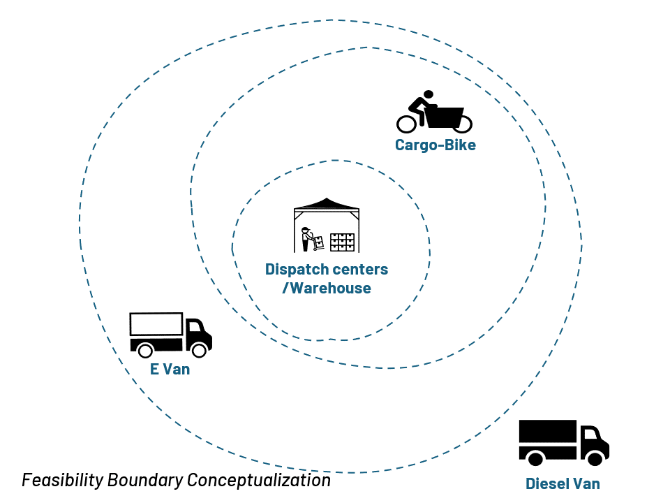 However, mode substitution is not universally feasible. Distance thresholds, capacity constraints, congestion, service time limits, and disruptions such as EV downtime restrict the operational viability of cargo bikes and e-vans.