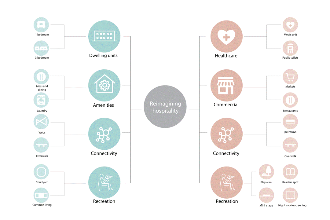 The proposal established a scalable transit-oriented prototype that reorganizes station precincts into structured activity zones, including health, recreation, and cultural areas. Modular housing units were designed for flexibility, allowing rapid deployment, expansion, and adaptation to changing needs. Spatial analysis demonstrated improved pedestrian connectivity, optimized land use, and enhanced utilization of previously underused parking areas. The design significantly increased functional density while improving environmental performance and public accessibility.