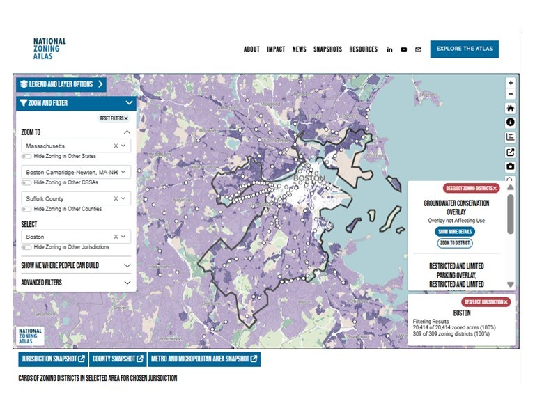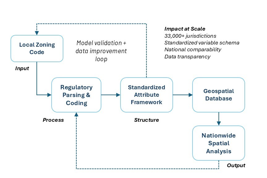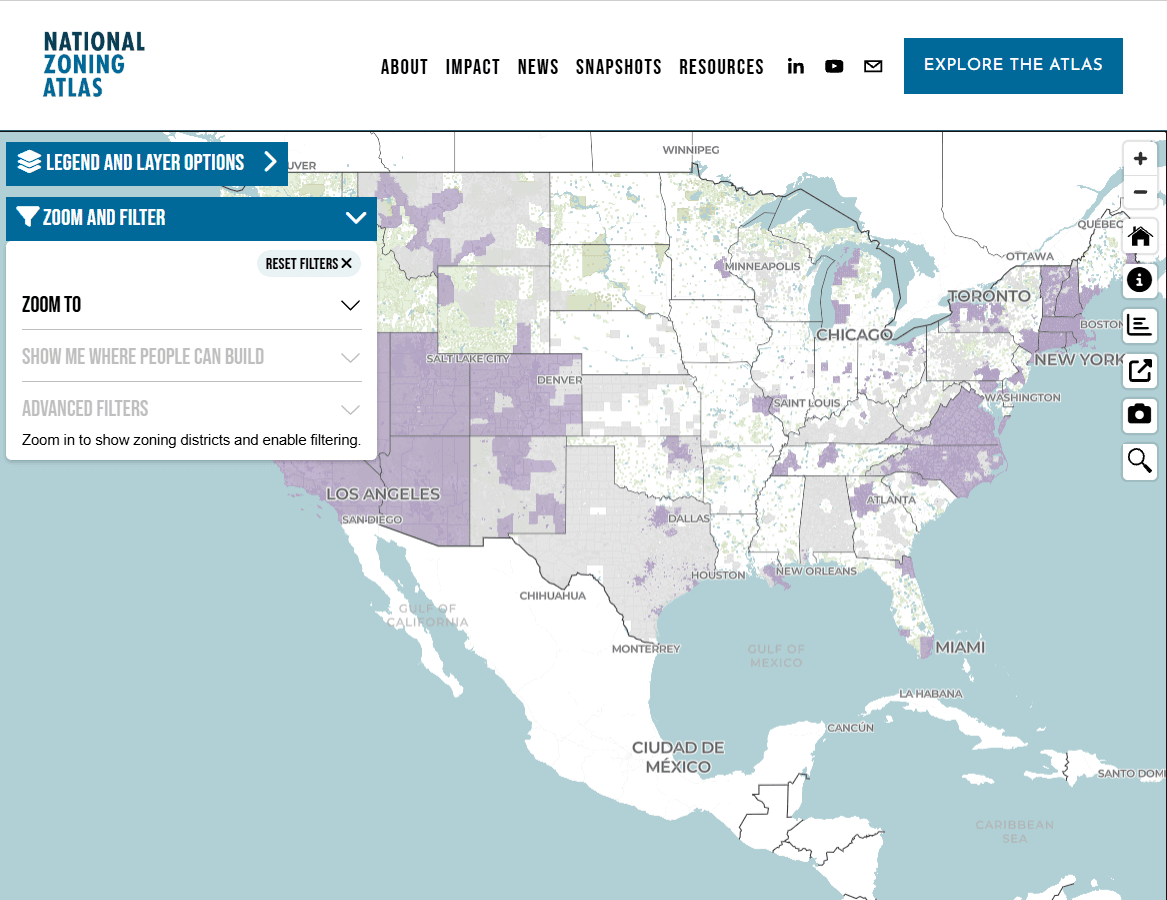 The National Zoning Atlas is the first nationwide effort to digitize and standardize zoning regulations, enabling researchers, planners, and policymakers to analyze land-use constraints at regional and national scales. This work supports housing policy reform, infrastructure planning, and land-use analysis by transforming fragmented regulatory information into accessible geospatial data.